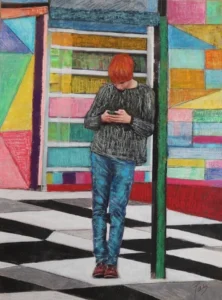 La estética vertiginosa, el ensamblaje de sus pinturas, el ser en movimiento, las corporalidades, el lugar político de esos cuerpos, todo eso genera un espacio crítico y metafórico que implica la construcción del ser en la vida urbana y en la imagen en un tiempo donde los hiperobjetos nos rodean permanentemente.